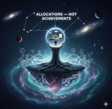In that sense, everything we possess today is not solely the result of our present hard work. Much of it is given by Nature. We do not choose our birthplace, our parents, our early environment, our natural talents, or the time period we are born into. These are allocations — not achievements.